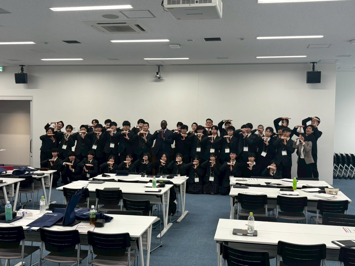 プログラムの最後には全員で集合写真を撮りました。集合写真はTakigawaのTとJUNTENDOの「J」を合わせた「TJ」ポーズで3泊4日の国内Science研修(東京)を締めくくりました。